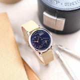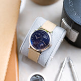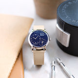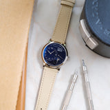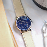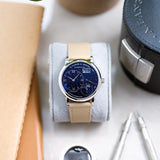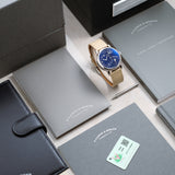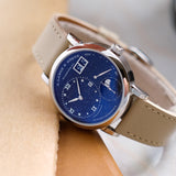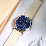 This 2022 A. Lange & Söhne Little Lange 1 Ref. 182.086 Moon Phase is in excellent condition and complete as a full set. This includes its box, papers, original dark blue leather strap featuring sparkling pigments to echo the dial and solid white-gold buckle. Additionally, this watch is sold with a Mr Watchley Grained Cream strap.