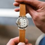However, its aventurine glass dial accomplishes this reference's whimsicality and charming allure. A technique developed on the island of Murano in Venice, Italy, 'Avventurina' (Aventurine in English) is perhaps the most popular glassmaking process of Murano-originated methods. Documentation covering its production dates from the 17th century and mentions how adding various metal oxides, such as copper and iron, to a hot glass mixture causes tiny particles of metals to crystallise as the glass mixture cools off. The result is a sparkling effect, regarded as one of Murano's most ambitious, long, and delicate glassmaking techniques. When needed to be produced on a small precise scale for the silver-based dial of this Lange, the process is tedious and requires real artisanal skill. With the 182.086, the addition of five-pointed stars for the hour markers of the hours and minute dial housed on the left leans into the starry-esque appearance of the dial base. As alluded to earlier, this Little Lange pushes the otherworldly charm to more significant levels with the inclusion of the moonphase complication occupying the top third of the subsidiary seconds. The unmistakable geometric orientation of this piece is a defining characteristic, and yet, despite the elaborate adornment, the date display remains commanding and legendary. Stylistically taking inspiration from the Five-Minute Clock at Semper Opera House in Dresden, on the Lange 1, the date aperture is confidently positioned and framed where the traditional one o'clock hour marker would sit. Furthermore, on the right-hand side of the dial is its neat vertical power reserve indicator labelled 'AUF' to 'AB', completing the quadrant of white gold hands throughout this piece.