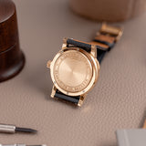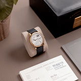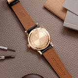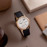 The elevated collectability of this piece is not solely due to its early production number but also its solid caseback, which conceals its extraordinary calibre. Of course, one could argue that hiding the beauty of this calibre behind a caseback is less desirable, but such is the iconic status of these references that they represent a time when Lange was fresh, finding its feet, and it marks the beginning of their unassumingly humble approach. Hiding it behind a solid caseback conveys utter restrained class and traditionality—an undiluted expression of the Lange 1.