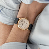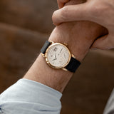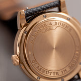 The Lange 1 is beyond compare when fitted to the wrist. Of course, its proportions (which are dictated by its 38.5mm case width) are remarkably comfortable and versatile on an array of wrist sizes, but how a Lange 1 sits and moulds to the wearer is truly distinctive. This effect is significantly aided by its rounded bezel, thick and compact lugs and clever uses of different finishing techniques. Furthermore, with this early 101.002, its slenderness is emphasised due to its solid caseback resulting in just a 9mm thickness, ensuring the watch is fantastic in formal or more casual settings.