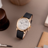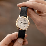 The Lange 1 truly shines, however, when exploring its dial and movement. Complementing its yellow gold exterior is a beautiful silver dial adorned with thermally blued hour, minute, and second hands, along with its power reserve indicator hand at the conventional three o'clock position. Commanding the top portion of the dial is the famed big double-digit date aperture which is inspired by Dresden's Semper Opera House. Towards the left-hand side of the dial, the Alpha style hands tracking the minutes and hours sit surrounded by faceted diamond hour markers and quarter Roman numerals. Ever so slightly overlapping this dial is the seconds subsidiary dial with its long needle style hand and peripheral black scale. The dial is further finished with the A. Lange & Söhne arcing signature along with 'Glashütte i/SA' ('in Saxony') underneath, and the readings for the power reserve and Doppelfederhaus, which references the twin-barrel set-up of the movement.