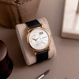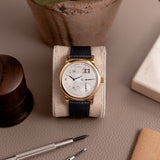 This A. Lange & Söhne Lange 1 101.002 in 18-carat yellow gold dates from approximately 1995 (sold in 1998 by Wempe) and is sold complete as a full set with its box and papers. The watch is presented in an unpolished, good condition. The piece is fitted to a Grained Navy Blue Mr Watchley matching the blue hands on the dial, and its original buckle is also included.