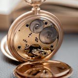 The famous Cal. 43 is nickel-finished, hand wound by turning the crown, 43 jewels, bimetallic compensation balance with gold poising screws, gold lever and escape wheel, finely engraved balance cock, swan neck regulator with diamond endstone.