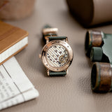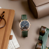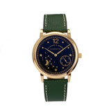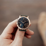 The hand-wound movement has a 1,058-year accurate moonphase indication. It is developed, produced and assembled in-house with flame-blued screws, gold chatons and red rubies adorning the warm German silver signature three-quarter plate, featuring an exquisitely hand-engraving on the balance cock – matched in contrasting beauty by the Glashütte stripes and the artisanal chamfers.