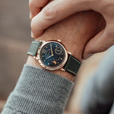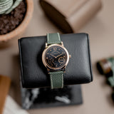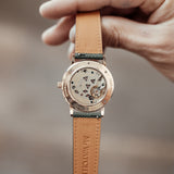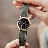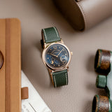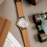 The dial, crafted from solid silver, counterparts the collection with its railway minute track, three subtle dots on each 15-minute markers and classic alpha-style hour and minute hands. But its vintage aesthetic meets quirky craft with astrological details, such as the seven gold appliques projecting the Big Dipper of the Ursa Major constellation with the encircling round appliques serving as the other asteroids.