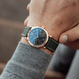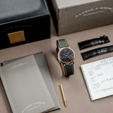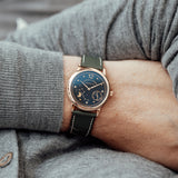 The refined hand-finishing of the German watchmaker is reflected in the branded crown, signed case and dial – the eminent arc brand signature referring to its cradle underneath: Glashütte i/SA (‘in Saxony’) – and pink gold Lange pin buckle and signed movement.