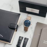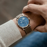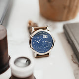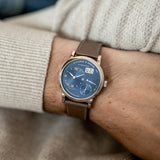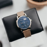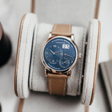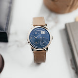 This A. Lange & Söhne Lange 1, ref 191.028 was created in 2017 as one of the four timepieces coined ‘Blue series’, together with the Lange 1 Daymatic, the Saxonia and the Saxonia Automatic, in line with the blue dial style trend in the horology world. Yet blue dials are very rare for A. Lange & Söhne – lacking nearly completely in their collection.