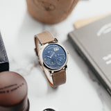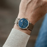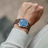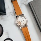 The blue dial is handcrafted from solid silver and embellished with solid-gold appliques and hour markers with hands made of rhodiumed gold. Characterized by its unique decentralized and asymmetrical dial design in a classic 18k white gold 38,5mm case, it features a hours and minutes sub-dial with appliqué Roman numerals, a smaller second sub-dial at 5 o’clock, an oversized double window date display with quick-change feature and a power reserve indicator.