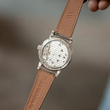 The A. Lange & Söhne Lange 1 191.028 houses the L121.1 caliber, as opposed to the L901.0 caliber from the 1997 101.027-edition. This hand-wound movement has a double-barrel with 72-hour power reserve and a free sprung balance with 6 eccentric poising weights.