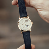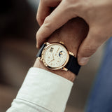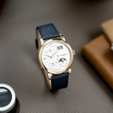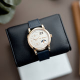 The Lange 1 Moonphase is an exquisite dress watch with superb proportions, featuring a traditional 38,5 mm round case with doomed bezel. It has a bright polished, slim profile – yet bold enough to please modern tastes – with delicate chamfer lugs, making it comfortable to wear.