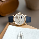 The straw-toned white dial, giving the watch face a marvelous warm tincture, is handcrafted from solid silver and embellished with solid-gold appliques with Alpha-style, luminova-tipped, hands made of yellow gold. Characterized by its unique decentralized and asymmetrical dial design, it features a hours and minutes sub-dial with appliqué Roman numerals, a smaller moon-phase sub-dial at 5 o’clock, the characteristic oversized double window date display with quick-change feature (enabled by the push piece on the upper left part of the case) and a power reserve indicator tracing three days of reserve.
