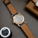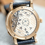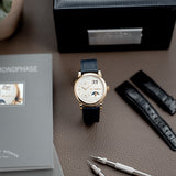 The yellow gold watch case is complemented by a Lange-signed yellow gold pin buckle. As yellow gold was considered a rare style choice in the 2000s, it is believed not many pieces of this model have been produced.