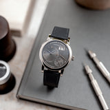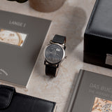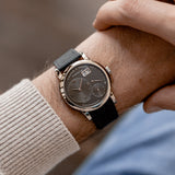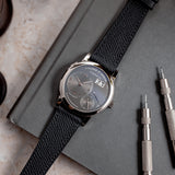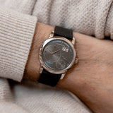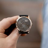 This Lange 1 Ref. 101.030 is an extremely special and unique watch on the wrist. The case is moderately sized and thanks to its definitive lug design it wears fantastically well on a range of wrist sizes; even those who frequently wear over 40mm watches. Not only is this dial colour incredibly rare, but it’s also exceptionally versatile. Grey works with all manner of outfit colours and styles, easily dressing up or down depending on your desire. The sense of occasion the Lange 1 dial design provides with every glance down to the wrist never gets old.