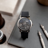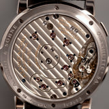 It is believed that this 101.030 grey dial is one of the rarest configurations for the 101 series of Lange 1 ahead of the ‘Darth’. Dating from 2007, this grey Lange 1 is an outstanding example of a seldom-seen dial colour on a modern-day icon out of Germany. Measuring 38.5mm wide this white gold encased watch is a proportional masterclass with a thin brushed case body fitted with straight lugs which hug the wrist from behind. From a top-down view, the watch is polished from bezel to lugs with the addition of tapering chamfers gently blending into the brushing seen from a profile view.