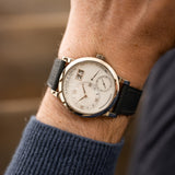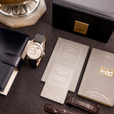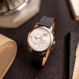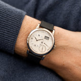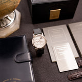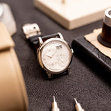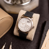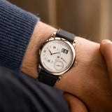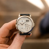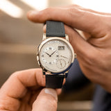 This A. Lange & Söhne Lange 1 Soirée 110.030 dates from 2010 and is available today as a full complete set. The watch is presented in good condition with small signs of wear and has recently been serviced. The piece is fitted to a Mr Watchley Grained Anthracite leather strap.