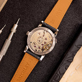Powering this Lange 1 is the pioneering L901.0. First sketched in 1990, this calibre is the first Lange 1 movement created for the model series. Characterised by its ¾ plate produced in German silver, it features gold chatons, blued screws, 53 jewels, 72 hours of autonomy via its twin mainspring barrels, and a highly decorated, hand-engraved balance cock with a swan neck regulator. This movement played an enormous role in establishing the reputation of A. Lange & Söhne. It ensured the brand's dual focus on Germanic design and technically wonderful movements was met from day one.