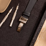 To emphasise the mystical elegance of its dial, the unmistakable geometric orientation and white gold furniture are loaded with personality. Beneath its date is a vertical power reserve indicator labelled 'AUF' to 'AB' before the subsidiary seconds dial is revealed with a purposefully stripped-back design to allow its needle seconds hand with a long pointed counterbalance to take command. Just kissing the ten o'clock placement of the seconds sub-dial is the bulk of the time-telling functionality, with the current hours and minutes readings displayed through alpha hands. Offering the clearest view of its jewel-like dial, its dial furniture need not be elaborate with petite diamond-shaped markers and Roman numerals once more reflecting the modest restraint of the Lange 1. Tastefully brilliant with a bespoke connection to its naturally occurring dial, the Lange 1 is the dream canvas for the mother of pearl as its spacious dial allows for a striking view of its nuance, a view that shimmers and shifts with even the lightest of wrist movements. There's special, and then there's the Lange 1 Soirée.