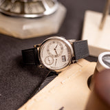 Lange & Söhne watches have an aura in person. It's almost on the cusp of being unexplainable, but pieces that have left the Glashütte workshop inherently feel important and meaningful. That feeling is only intensified with this incredible Lange 1, as its whimsical, dreamy dial is utterly sophisticated. A complete unisex piece, the iridescence of its dial is subtle as it constantly shifts and dances with light and shade. Depending on the light levels, tones of pink, red, blues, greys, and muted silvers appear. Every time you glance down at your wrist, there's a strong likelihood of a different appearance, colour or texture; that is perhaps the ultimate desire of this notable Lange.