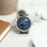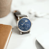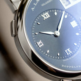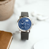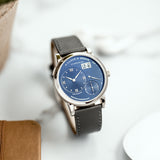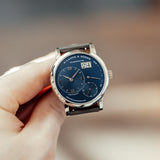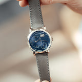 This A. Lange & Söhne Lange 1 191.028 watch was created in 2017 as one of the four timepieces coined ‘Blue series’ (together with the Lange 1 Daymatic, the Saxonia and the Saxonia Automatic), in line with the blue dial style trend in the horology world. Yet blue dials are very rare for A. Lange & Söhne – lacking nearly completely in their collection.