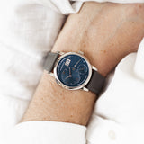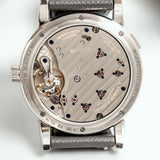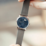 The deep-blue dial is handcrafted from solid silver and embellished with solid-gold appliques and hour markers with hands made of rhodiumed gold. Characterized by its unique decentralized and asymmetrical dial design in a classic 18k white gold 38,5mm case, it features a hours and minutes sub-dial with appliqué Roman numerals, a smaller second sub-dial at 5 o’clock, an oversized double window date display with quick-change feature and a power reserve indicator.