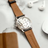 The A. Lange & Söhne Lange 1 191.028 houses the L121.1 caliber (as opposed to the L901.0 caliber from the 1997 101.027-edition). This hand-wound movement has a double-barrel with 72-hour power reserve and a free sprung balance with 6 eccentric poising weights.