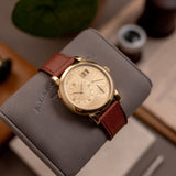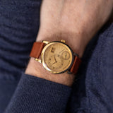 The A. Lange & Söhne Lange 1A Ref. 112.021 measures, just like other Lange 1’s, 38,5 mm in diameter. This particular model is ever so slightly thicker than other Lange 1 models due to the use of a golden dial. Following this, the timepiece measures 0,2 mm thicker at 10 mm. Despite this slight change, the Lange 1A wears beautifully on the wrist, with its 38,5 mm diameter it is a perfect fit for almost every wrist. Thanks to the solid 18K yellow gold case, there is a noticeable heftiness to the watch which results in a welcomed feel when put on the wrist.