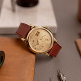 As mentioned before, this is the first ever limited edition by A. Lange & Söhne for the Lange 1 model. Making it more unique is that everything about the case, dial, date wheel, hour and minute hands is made from solid 18K yellow gold, except for the blued steel seconds hand. On this specific model of the 112.021, a blued seconds hand is applied, which contrasts beautifully with the rest of the dial and case. But not all models are fitted with a blued seconds hand, some of the limited 100 pieces are fitted with a yellow gold seconds hand. There is no known reason on why some pieces are fitted with different second hands or how many are fitted with each particular hand, but it is certainly a detail every watch enthusiast can get excited about.