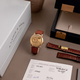 This timepiece is accompanied by an attractive full set. The set includes; outer box, inner box, papers, original strap, original buckle. The watch itself is in immaculate condition and it comes directly from the first owner.