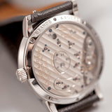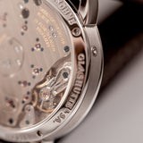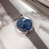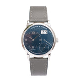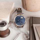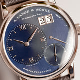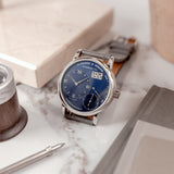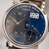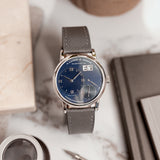 Custom orders are nothing new in the world of watchmaking. From the earliest sales of pocket watches to our favourite watch manufacturers today, made-to-order is a service typically out of sight from public view, only on a need-to-know basis, behind closed doors. By their very nature, custom creations are bespoke and symbolise the confidential relationship between the watch manufacturer and the soon-to-be owner, bringing us here and to this Little Lange 1 reference 111.035X. At least, that's how it started off life in 2000. That was before a client of Wempe, Germany requested the Little Lange 1 black dial, in all its stealthy, classically contrasted glory, be converted for something a touch more casual and arguably more dynamic. The desired dial was the rare early blue expression which carries distinctive nuance not often associated with Lange of the time. Although the dial had made its way to other references previously for the 101.028 (yellow gold) and 101.027 (white gold), these were both 38.5mm Lange 1 references. When it came to the smaller Little Lange 1, this dial only appeared serially on the 111.028, a yellow-gold cased reference. Therefore, this 111.035X makes it the only known Little Lange 1 with a blue dial and a white metal. Platinum, to be precise.