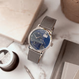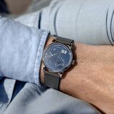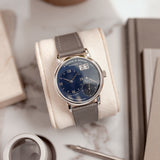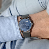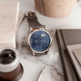The 36.5mm wide platinum case is both compact and substantial, akin to its notched lugs that give the watch its industrial stance. Its central caseband is brushed, while the bezel and lugs are in high polish, delivering visual contrast that exemplifies that slight unique sheen only platinum can. Of course, a platinum-cased Lange isn't something to brush aside, but in the topic of this 035X, the combination of its dial is where the conversation leads. In some light it appears as a uniformed navy, while in others, the dial suggests a two-tone rendering due to two different treatments: vertical brushing and circular graining. The timekeeping dials are where the latter of treatments is present, occasionally giving off a darker, rich navy tone, leaving the remaining dial (or canvas, if you will) to deliver the uber-subtle brushing. White gold furniture from the Alpha hands to the mixture of diamond-shaped and Roman numerals, as well as the double date window framing ensure those all-important L1 hallmarks are as crisp as can be. When compared to other references with traditional dials such as silver, this individual execution of blue is undoubtedly striking and elevates the already present fascination of a platinum Little Lange 1 enormously.