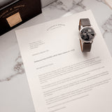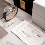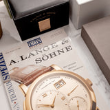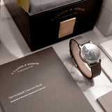 Suppose the existence of this 111.035X alone wasn't adequate. In that case, the watch is complete with an all-mighty set including its box, outer box and sleeve, original manual, original platinum pin buckle, warranty papers, A. Lange & Söhne push pin for the date advancer on the case side, extract, service booklet, magazine, and VHS cassette from A. Lange & Söhne. In addition, the set is complete with the original letter from Lange Watches GmbH confirming the custom order, a letter dating from 2023 authenticating the initial letter and assigning the piece with a new 111.035X reference number.