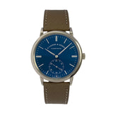 Wholly contemporary and tastefully understated, the dial of this Saxonia is a galvanised solid silver blue carrying white gold dial furniture and white printing throughout. Delicately applied and remarkably slim baton hour markers surround the watch's dial made up of multi-faceted angles. Such markers are doubled up for the twelve, three, six, and nine placements which subtly accentuate coherence. However, the six o'clock markers do feature a cut design to allow for the sub-register to track the running seconds of the piece. A concentric circle guilloché design with a sunburst effect adds texture to the sub-register, accompanied by additional depth thanks to its recessed configuration. White printing internally surrounds the seconds register for a contrast friendly aesthetic.