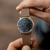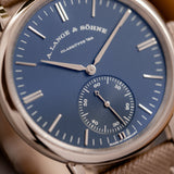 Completing this modern timekeeper is a handset delivered in textbook A. Lange & Söhne style. Produced in white gold, the hour and minute hands are Alpha style in design with an elongated needle style hand with a diamond-shaped counterbalance elegantly measuring housed in the six sub-register.