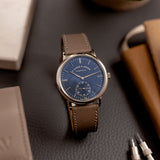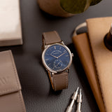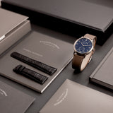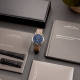 This 2017 A. Lange & Söhne Saxonia Blue 380.028 is presented in mint condition. The watch is sold as a complete full set with the original Lange white gold pin buckle and the original, unworn watch strap included. Additionally, the watch is paired with a Mr Watchley Taupe Saffiano strap to highlight just how versatile the piece truly is.