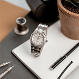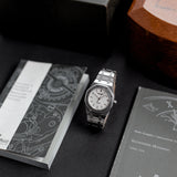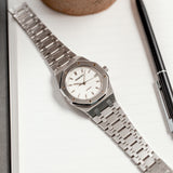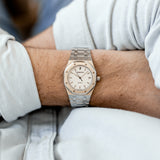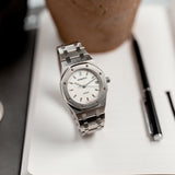 Complete with papers dating back to 2008, this F series 14790ST is a magnificent example of a mark three-dial, the final evolution of the model’s lifespan representing a gradual modernisation. The first and potentially most obvious way to tell that this is a mark 3 dial is via the hour markers which are more rounded and petite in size when compared to older examples which are longer and thinner. This change allows room for a 5-minute mark scale surrounding the watch. Another subtle but tangible difference on this 14790ST can be found in the dial font which is both bolder and neatly framed for the logo and ‘Automatic’ text. All of these details sit on top of a textbook Royal Oak dial, this time in a larger tapisserie pattern and a brilliant white colour. Sure, these changes are slight, but they profoundly impact the watch. Although this timekeeper is a trophy of watch design, there is a usable amount of functionality on offer here. The dial houses bright, polished furniture and hands which are operated through its hexagonal crown. A beautifully positioned date window occupies the 3 o’clock position and thanks to its dial matching backing, cleverly doesn’t impact visual balance.