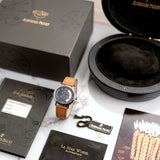This Audemars Piguet Millenary Star Wheel 25898ST/O/0020VE/01 shows normal signs of wear with some hairline scratches but no serious dents. It is very much in honest condition and is complete as a full set. This includes its outer and inner box, full paperwork, original leaflet, and the iconic AP folding buckle. The watch is sold on a Mr Watchley Smooth Boxed Gold Calf Leather watch strap and dates from 2000.
