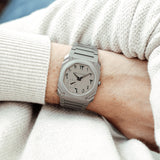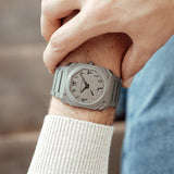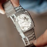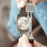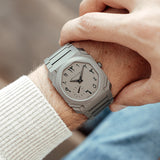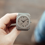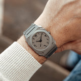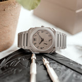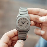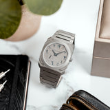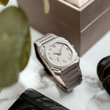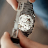 The Bulgari Octo Finissimo is further distinguished by its stunning titanium bracelet, recessed at its center, offering a stunning perception of depth on the wrist. It comes with a matching titanium folding clasp, expressing the watch cleverness from start to finish. The clasp folds flat into the bracelet, with the swing-arm sitting flush once buckled down on the wrist, making no compromises on the watch slenderness.