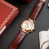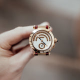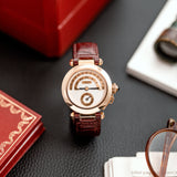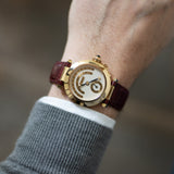 This stunning timepiece spots the quintessential Vendome lugs designed by Louis Cartier in 1932. Its refined finishing is furthermore enhanced by the incomparable CPCP wallpaper engravings on the caliber, visible through the transparent sapphire back.
