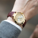 When the sun-hand passes the 18 (6 PM) on the upper scale, the moon-hand starts again at the lower bow, indicating the hours between 18 and 6 (6 PM and 6 AM). The sub dial at six, often used to indicate seconds, displays the minutes, underlining the watch’s distinctiveness.
