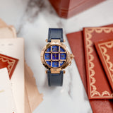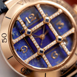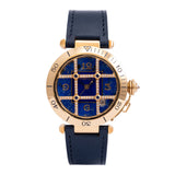 The dial follows the signature style of the Pasha de Cartier with its square within a circle, beautifully brought to life by the difference in the pieces of stone used. Deep blue lazurite is used for the central square, the heart of the watch, which is signed and framed in gold. Across the rest of the dial, we see a key feature of lapis lazuli - its pyrite flecks, its golden stars - sparkle.