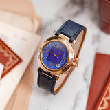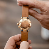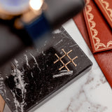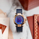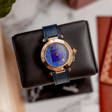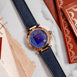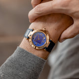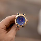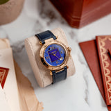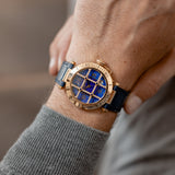 The blue of the dial, that blue of an infinite and all-consuming starlit night sky, is fashioned from the semi-precious stone, lapis lazuli. A mix of deep blue lazurite, golden pyrite and white calcite amongst other minerals, it is considered to be a highly spiritual stone, able to foster the connection between the physical and celestial planes. There is an undeniable feeling of something quite profound in its presence.