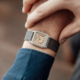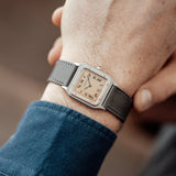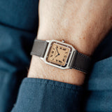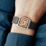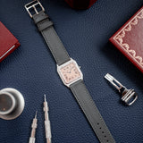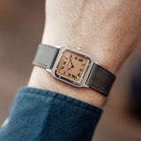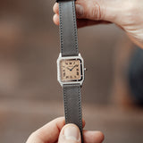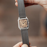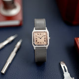 The Santos Dumont is fitted with a grey navy Saffiano strap that contrast well with the salmon dial and matches the blued Breguet hands.