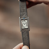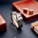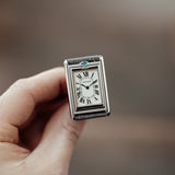 This manual-winding Basculante is a special edition, produced in a limited number of 365 pieces (in 1999-2000-2001). Its symmetrical steel case measures 38mm and has an elegantly thin proportion, thanks to its 2.1mm thick caliber. The straight lines and rounded corners of the case are playfully discontinued by the winding crown, placed at the top of the case, below the blue signature crystal of Cartier (the cabochon) that is used to lift the case out of its frame to flip it over.