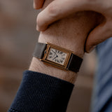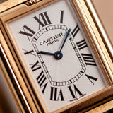 This manual-winding Basculante is a special edition, produced in a limited number of 365 pieces (in 1999-2000-2001). Its symmetrical, rectangular 18k yellow gold case measures 38 mm x 26 mm and has an elegantly thin proportion, thanks to its 2.1mm thick caliber – making it possible to rotate 360 degrees on its vertical axis while being protected in its main body. The straight lines and rounded corners of the case are playfully discontinued by the winding crown, placed at the top of the case, below the blue signature crystal of Cartier (the cabochon) that is used to lift the case out of its frame to flip it over.