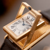 While being flipped, the Basculante can also stand upright with the frame laid flat, giving it the character of a desktop or travel clock. The timepiece comes with a Cartier alligator leather strap and a 18k yellow gold Cartier deployant buckle. Dial, case and movement are signed.