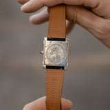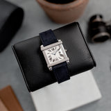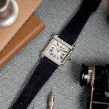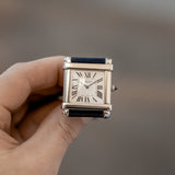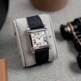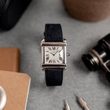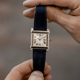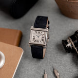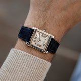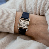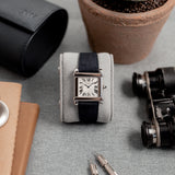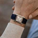 This rare reedition of the 1922 original has been introduced with a slightly larger case, measuring 28,7 mm x 28,2 mm, a transparent caseback and a 437MC caliber by Piaget. The evocation of interlocking portico lintels, squares up the watch face and draws the attention to the splendid 18k gold silvered guilloché rosette dial with its classic Roman numerals and blue Breguet steel hands. The timepiece further spots the blue signature crystal of Cartier on the crown (the cabochon), mineral crystal and a perfectly integrated strap held in between its straight parallel brancards.