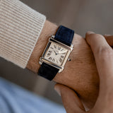 The watch is fitted with a Mr Watchley Navy Blue nubuck strap