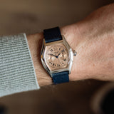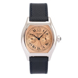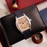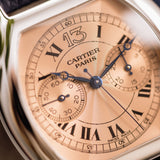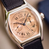 An absolute rarity for Cartier, salmon dials are seen on Cartier pieces only for special occasions and are always attributed to very low, limited production pieces. Not only has the dial been afforded this striking colour but every millimetre of the dial is covered in engine-turned guilloché decoration evoking that sense of limitless, euphoric celebration. Rosette guilloché extends from the centre to the edge of every part of the dial, contrasted only by the circular guilloché finish of the two, fractionally sunken subdials. When the light strikes, the dial softly glistens with varying golden hues - those scintillating sparks of Cartier magic at their very finest.