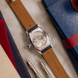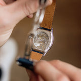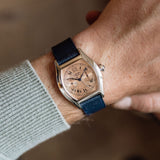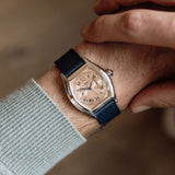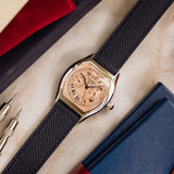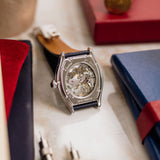 The Tortue design originated in 1912 and was just the third wristwatch to be designed by Louis Cartier. While the Tortue never garnered the same hype as the Tank would in later years, it did - and still does - strike a chord with Cartier enthusiasts. Its unique form made it the ideal model to become one of the very first Cartier timepieces to incorporate a complication and in the late 1920s, Cartier released its first Tortue Monopoussoir. A chronograph operated by a single push-button, contained within the crown: one push to start, a second push to stop and a third to reset. A neat, chic complication that is seldom seen - even today. When it came around to the creation of the now highly-regarded Collection Privée Cartier Paris in the late 1990s, one of Cartier's first timepieces with a complication was a must to revisit. Two versions of the CPCP Tortue Monopoussoir were released in 1998. One in yellow gold limited to around 400/500 pieces and one in white gold, limited to around 200/300 pieces. Both, understandably, are highly coveted timepieces.