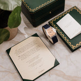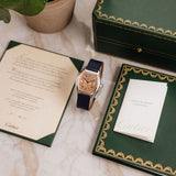 This timepiece, which could easily be described as the summum of Cartier collecting, has just been serviced by Cartier and is therefore in perfect condition. It comes with its full set, which includes its original green (rather than traditional red) box, white gold folding buckle, an unworn Cartier crocodile strap and Cartier's certificate of authenticity.
